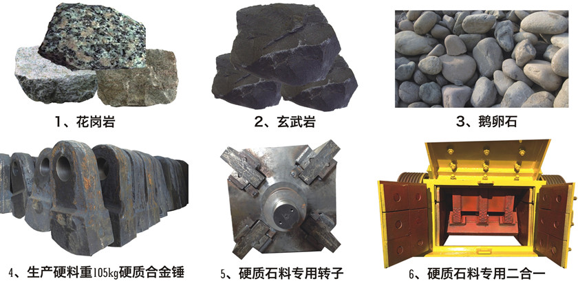 可破碎花崗巖、玄武巖、鵝卵石、鐵礦石等高硬度、磨損大的物料。破碎硬質(zhì)石料選用鑲大金牙錘或者同時澆鑄的硬質(zhì)合金錘,也可選用反擊式板錘。